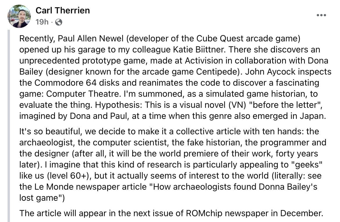 Un prototype du jeu Computer Theatre sur Commodore 64 a été découvert :